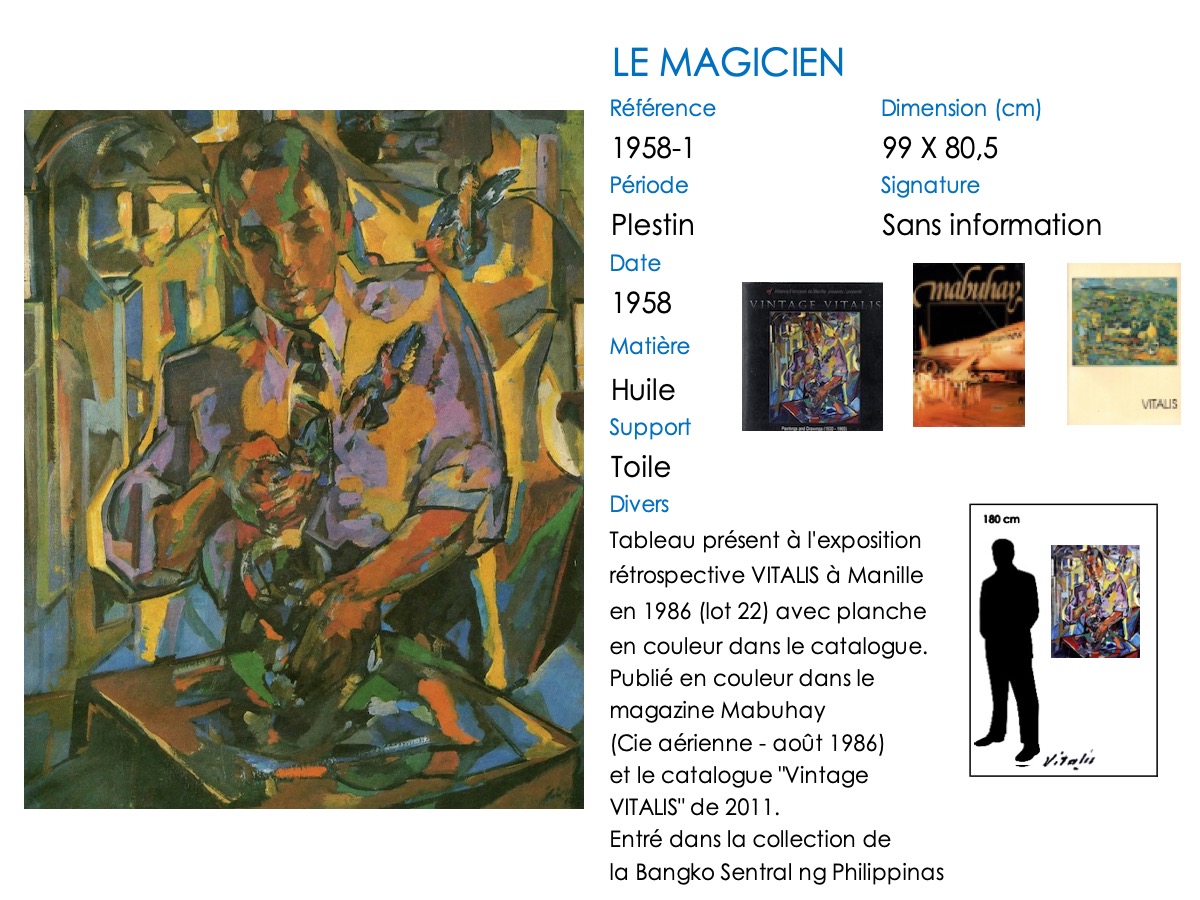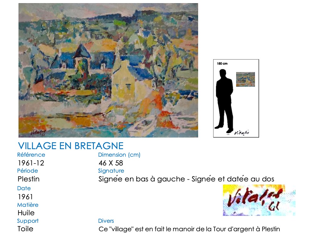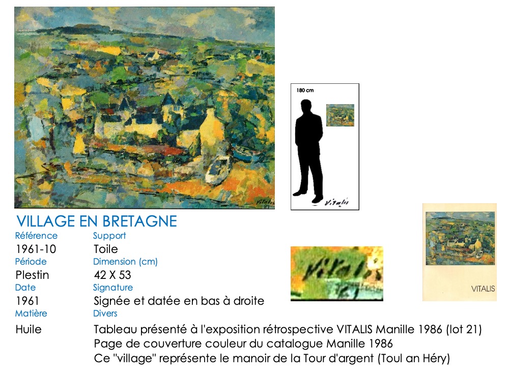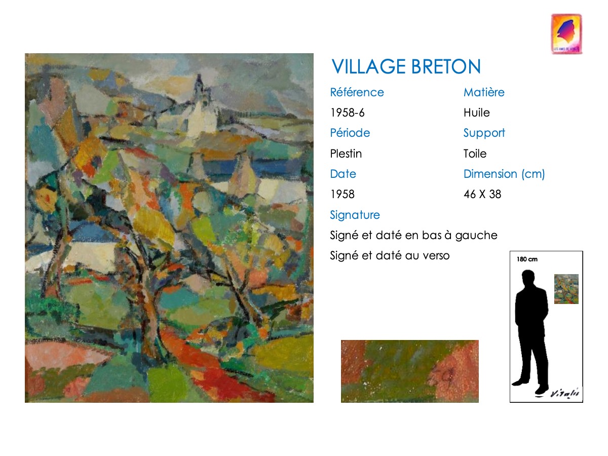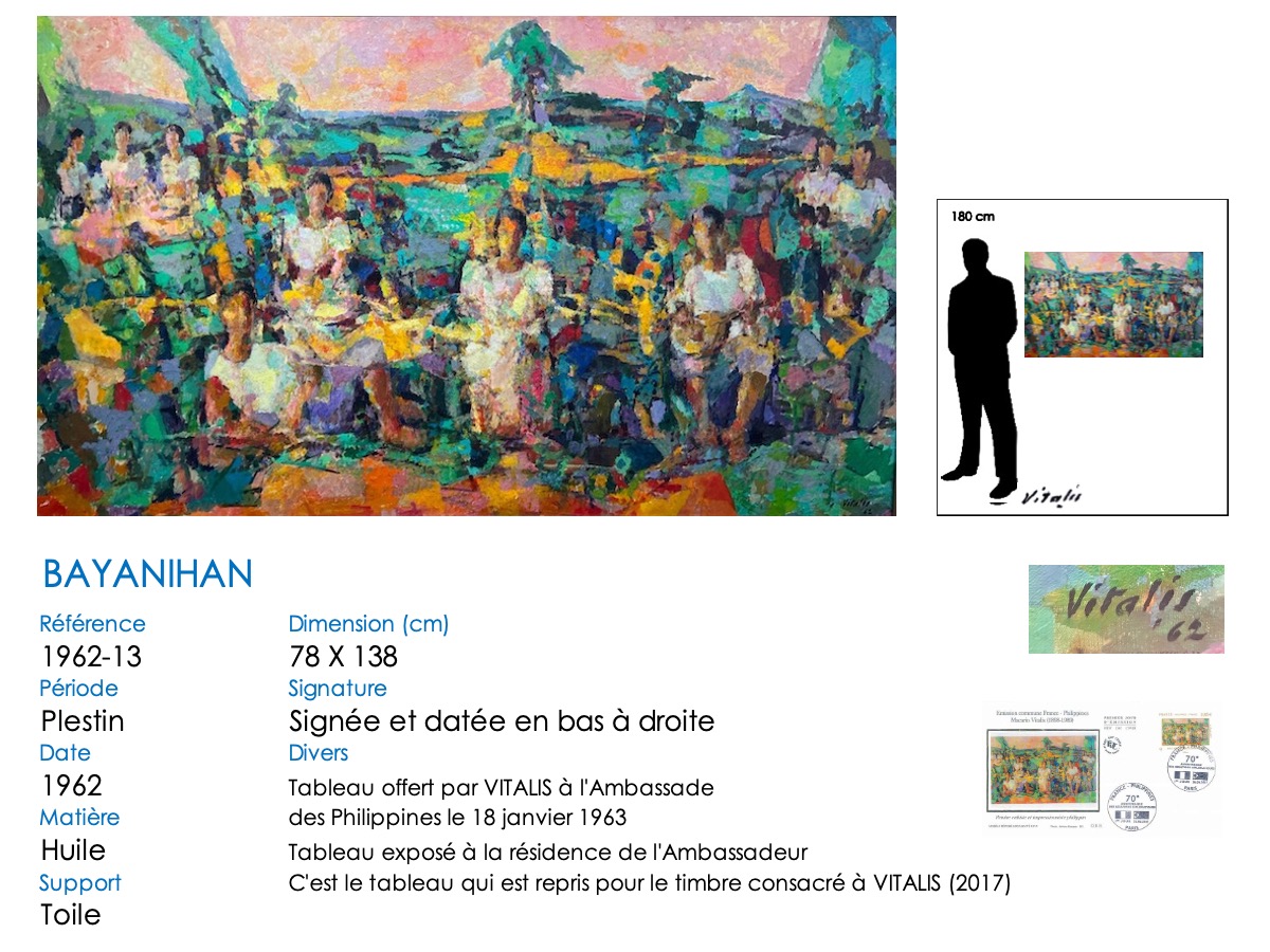 À partir de 1957, VITALIS s’installe définitivement dans le Trégor breton, à Plestin-les-Grèves. Son style va évoluer, passant du cubisme à une alliance cubiste-impressionniste. Il continue cependant à regagner régulièrement Paris pour proposer des toiles à Camille Renault qui les expose dans ses restaurants « Big Boy » et au « Bateau de pierre » ( voir article consacré à Camille Renault et Vitalis). En 1962, il assiste à plusieurs représentations de la troupe folklorique philippine, les « Bayanihan », au Théatre de Paris. Séduit, mais aussi nostalgique, VITALIS suit la troupe lorsqu’elle repart aux Philippines : en décembre 1962, VITALIS retrouve son pays natal 44 ans après l’avoir quitté.