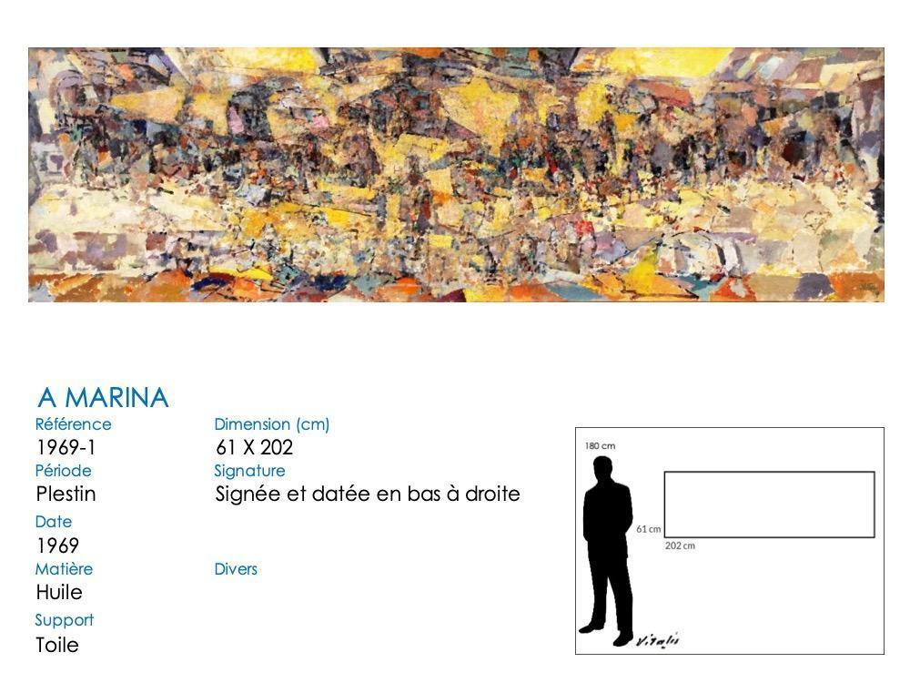 As shown above, this is a very large painting, produced in 1969. Once again, VITALIS shows itself to be a master in exploiting the color yellow. The title, “a marina”, surprises because the painting seems rather to represent an assembly of characters. I could not find another translation, even in a religious sense. If you have any ideas …