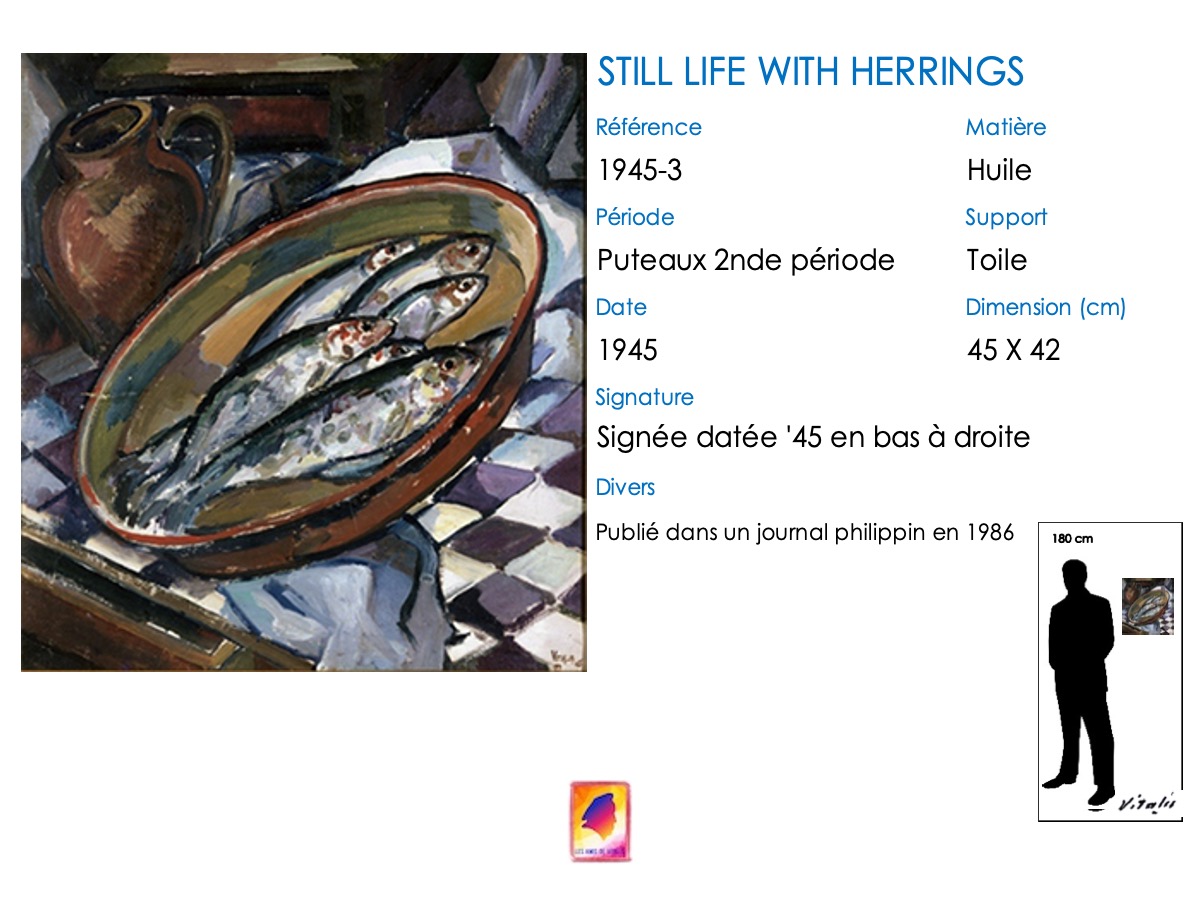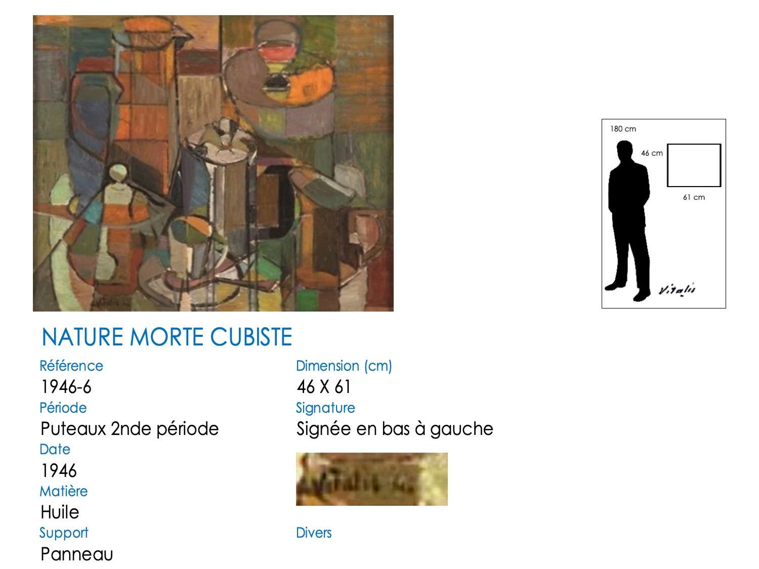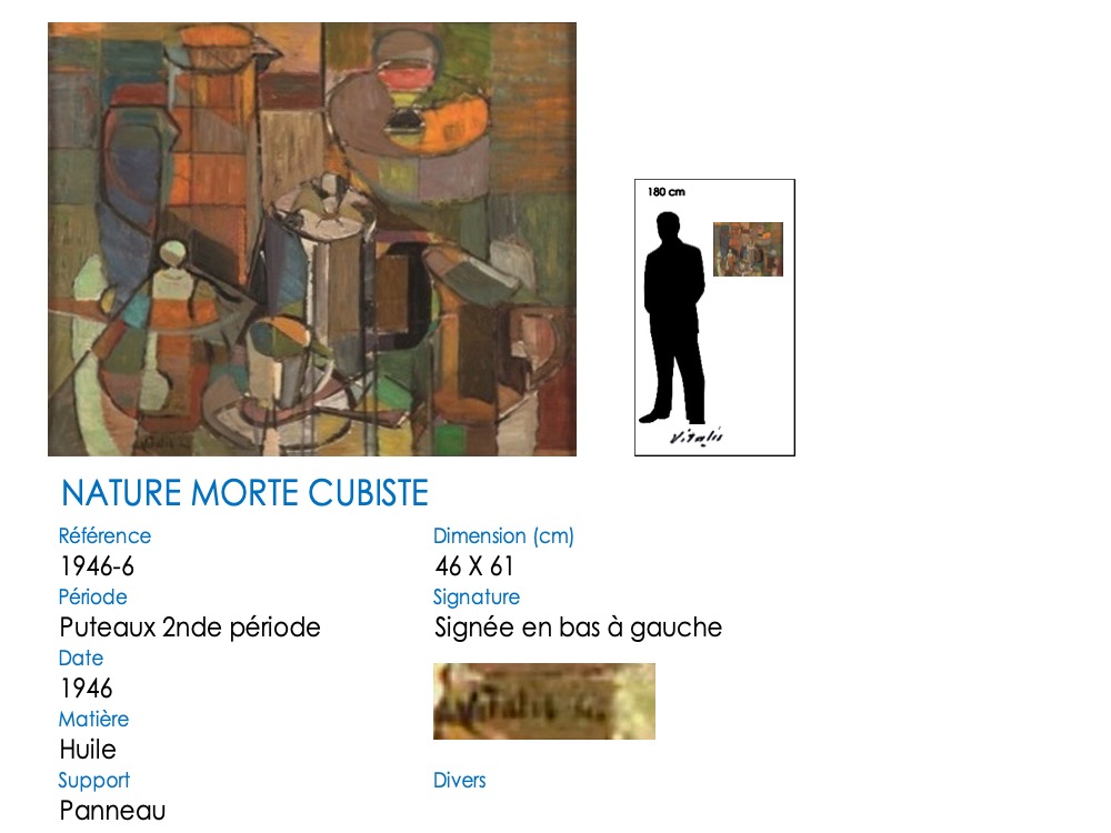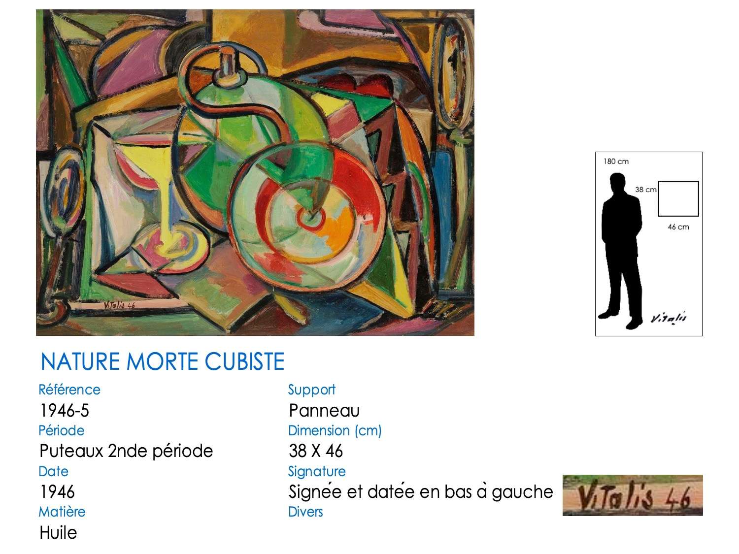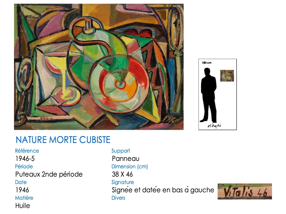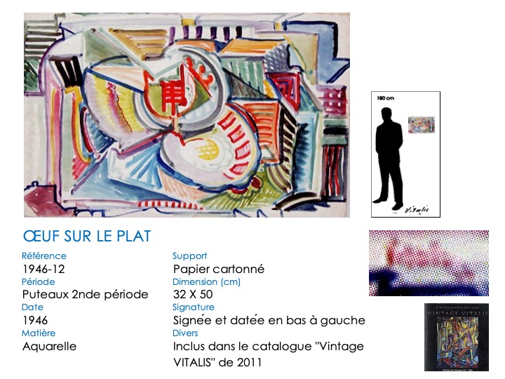 Abandonnant son style « Montmartre-École de Paris », VITALIS s’est tourné vers le cubisme en 1945, sous l’influence de Jacques VILLON, qu’il rencontre à Puteaux au restaurant « Big boy » de Camille RENAULT. En témoignent ici trois natures mortes, dont un inhabituel « œuf sur le plat » …