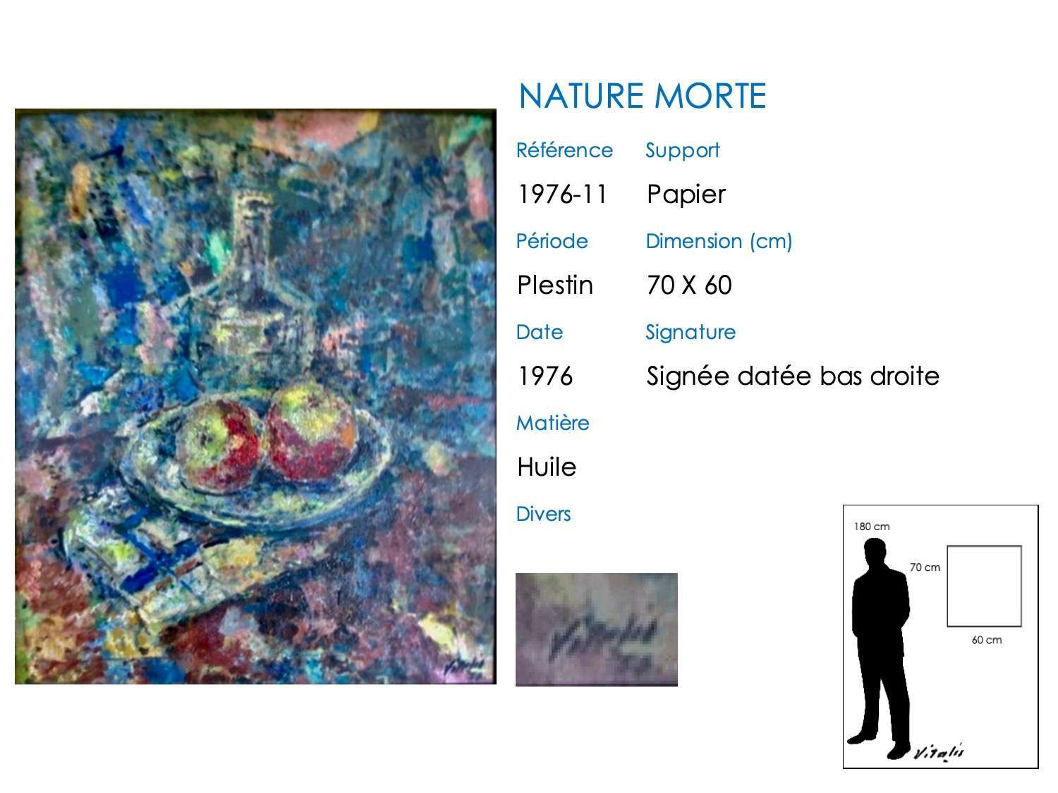 La formation artistique de VITALIS s’est faite sur un mode académique durant ses 7 années américaines (1918 à 1925 – à l’École des beaux-arts de San Francisco, puis celle de Philadelphie). Et pour l’obtenir, il a consenti de grands sacrifices : il l’a suivie seul, jeune philippin immigré sans argent, en travaillant la nuit de petits boulots (dont cet emploi de liftier d’ascenseur dans un palace de San Francisco qu’il aimait raconter). La réalisation de « nature morte » par VITALIS s’inscrit naturellement dans cette culture, mais pas seulement : il aimait particulièrement les natures mortes aux fruits de Paul CÉZANNE (pommes, oranges, etc.).