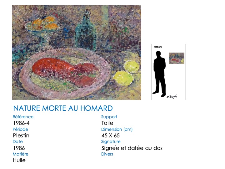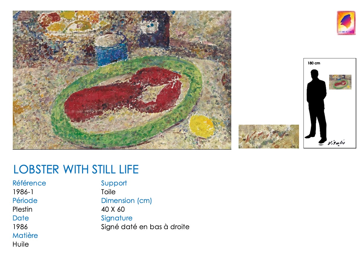 VITALIS était gourmand et gourmet. Ses homards rouges (cuits) n’attendent qu’à être dégustés avec un zeste de citron et un bon verre de vin. Sa nature morte « à la bouteille » de 1940 rappelle, dans le thème et sa composition, les fameuses natures mortes de Paul CEZANNE.