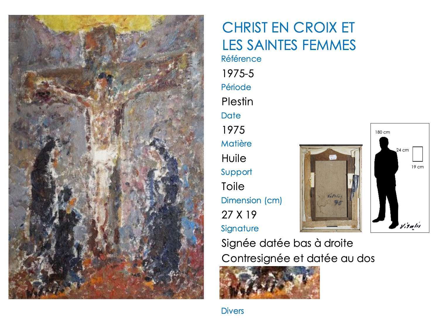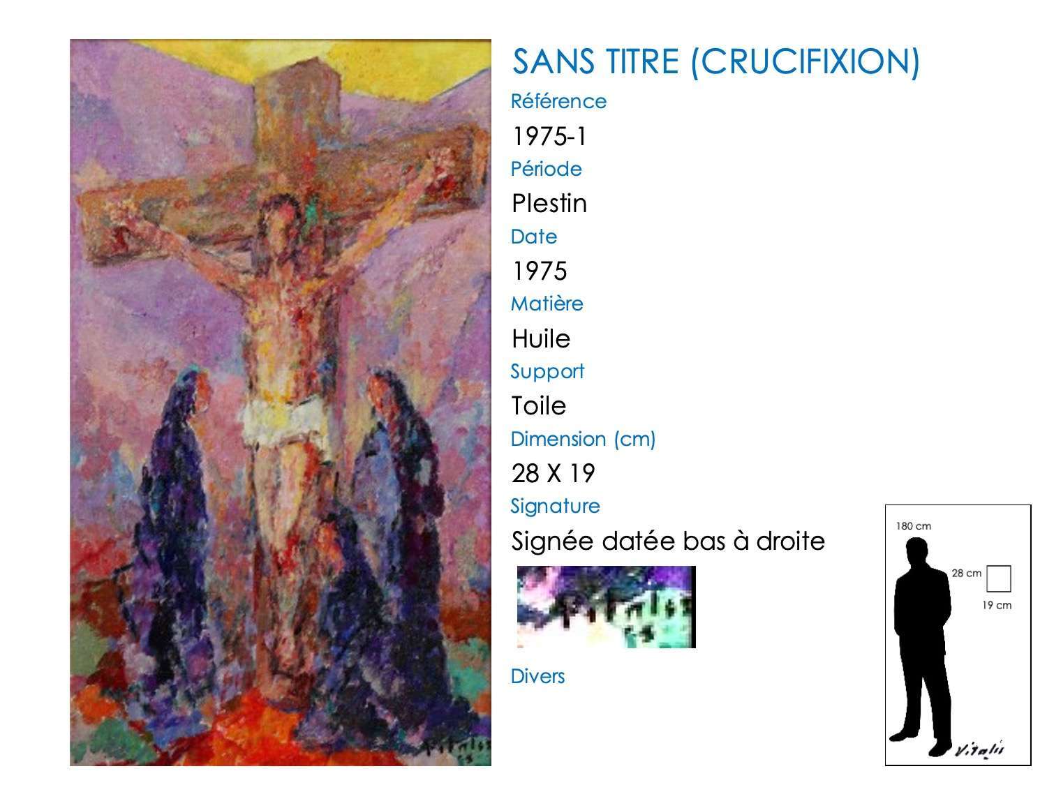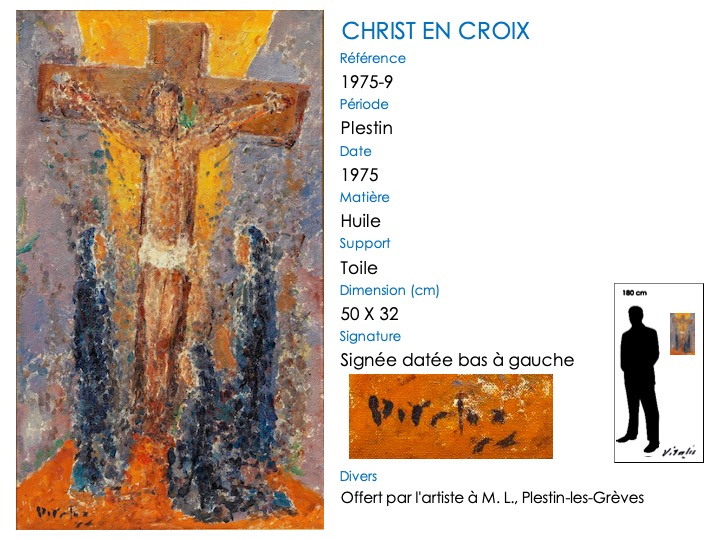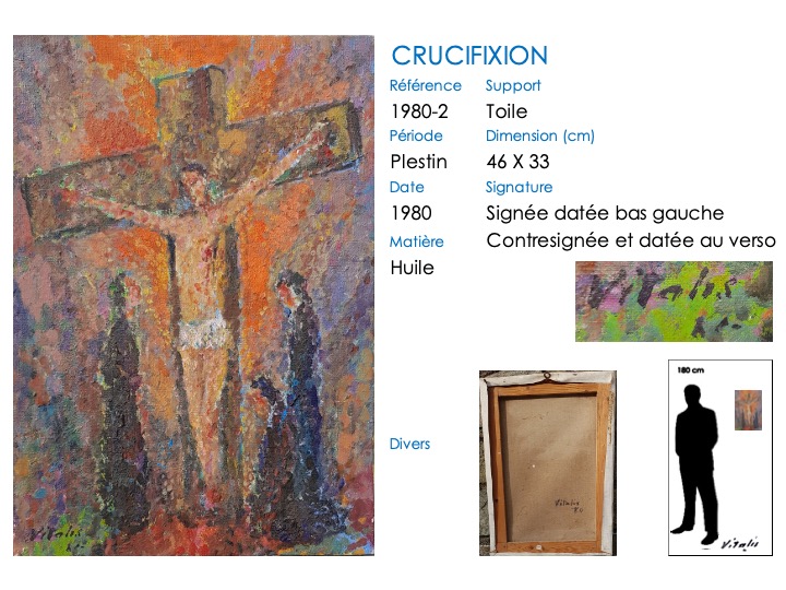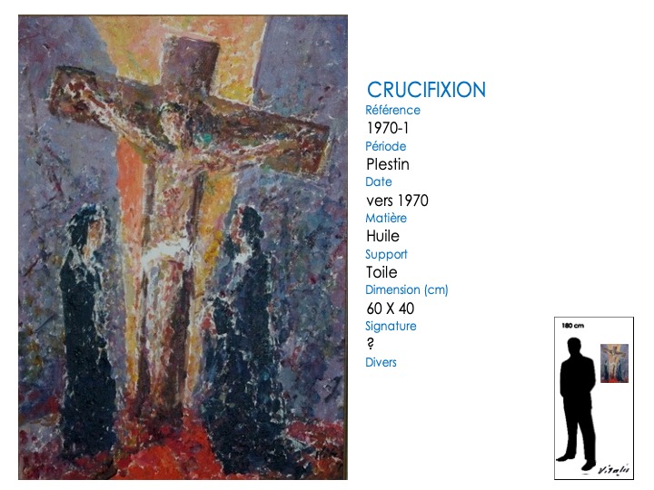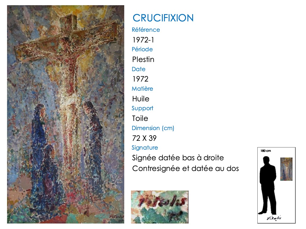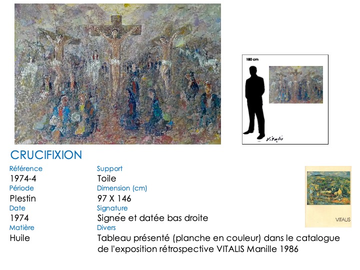 Ce thème de la crucifixion apparaît tardivement dans l’œuvre de VITALIS, le premier tableau connu datant de 1960 (VITALIS a alors 62 ans). En outre, il est toujours exécuté en style pointilliste.