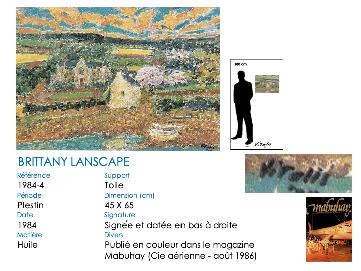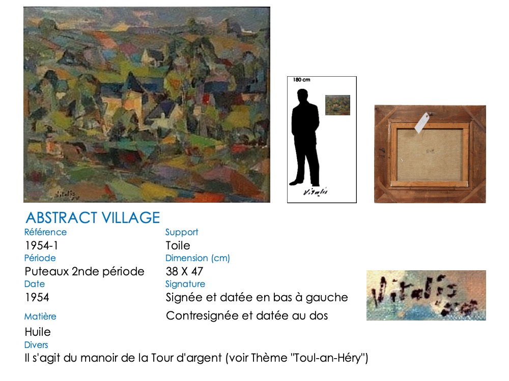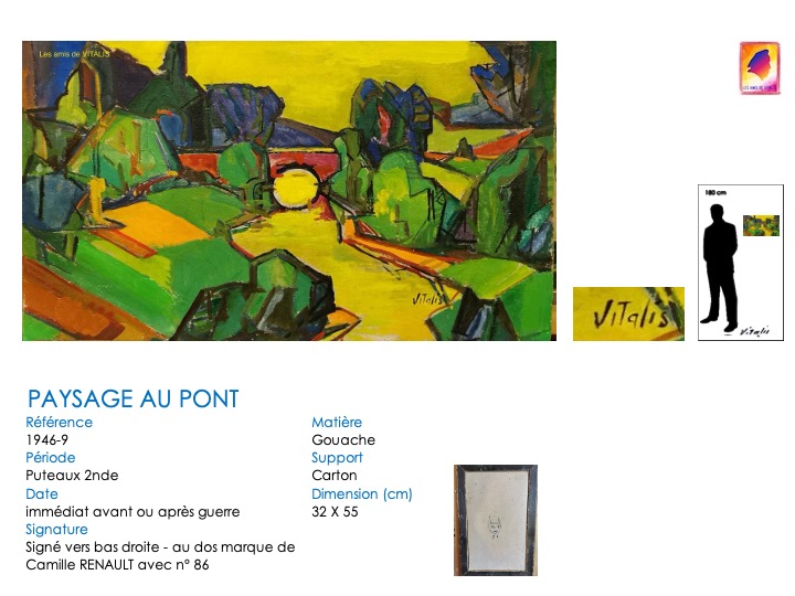« Le village », « Paysage de Bretagne », … plusieurs titres de tableaux désignent en fait une représentation du manoir de la Tour d’Argent, manoir du XVIème siècle situé en amont du pont. Les onze tableaux ci-dessous montrent des variations de style et de couleurs pour VITALIS (sa « cathédrale Notre-Dame de Rouen » ?). Notez bien la perspective variable de l’annexe située devant le rivière (gauche ou droite), tout comme la présence (massive) régulière d’une barque devant cette annexe.
