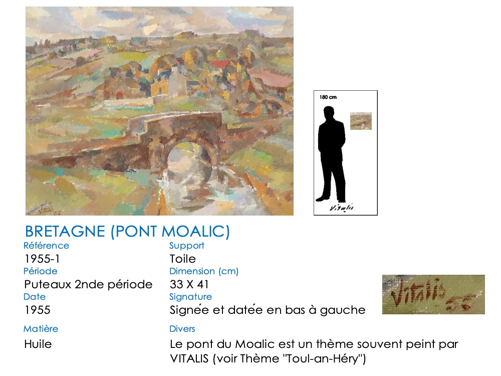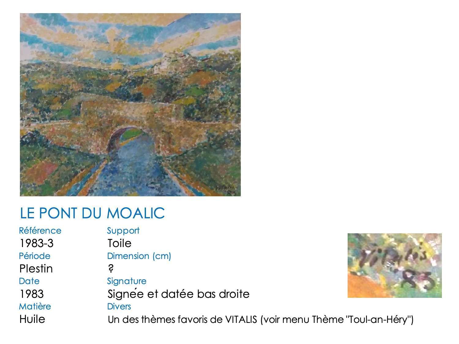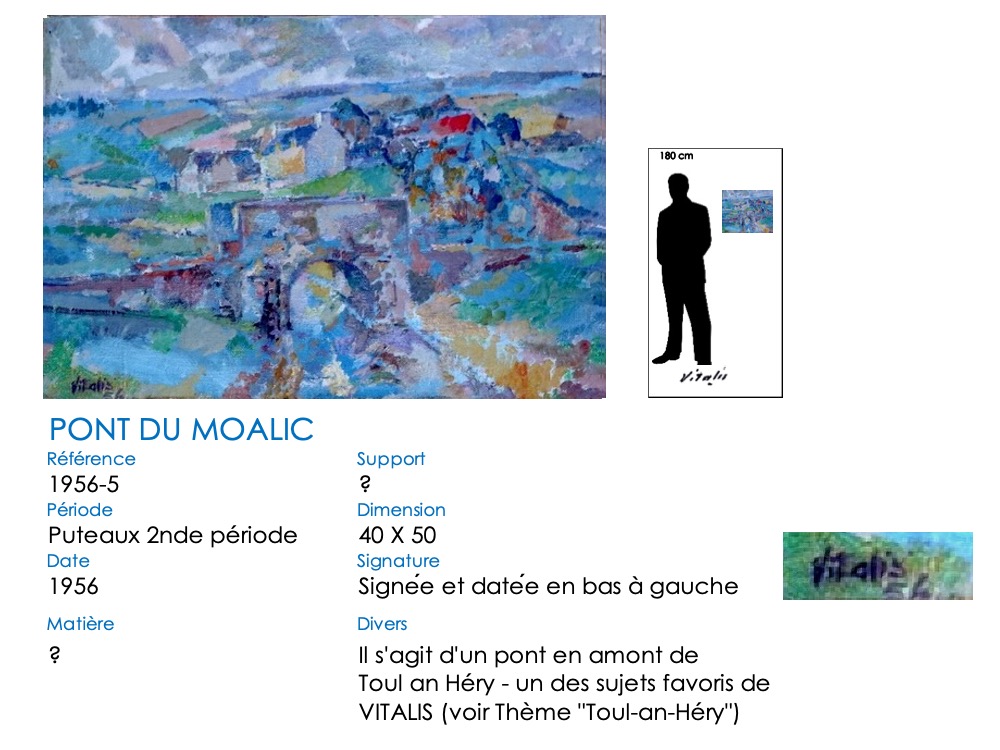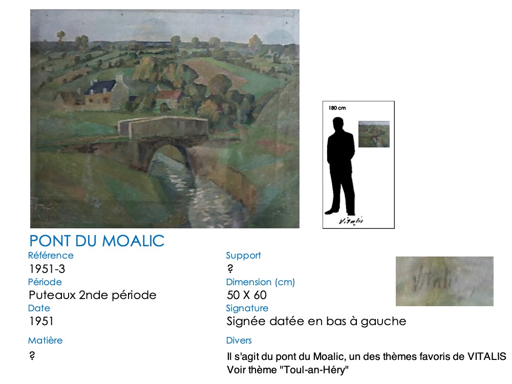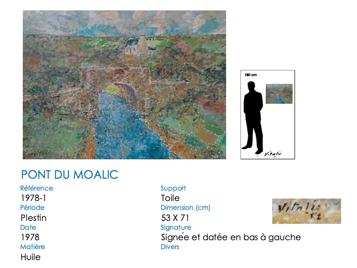 Le pont du Moalic a beaucoup inspiré VITALIS, et particulièrement son élégante arche ronde. Il l’a représenté dans sa vallée, avec les fermes et collines environnantes. Il a également repris la simple arche et son reflet, qui dessine un rond parfait. Aujourd’hui, l’arche en pierre a été remplacé par un tablier en béton, mais les méandres herbeux du Douron sont toujours là … Notez bien aussi la différence de représentation du tablier du pont, légèrement anguleux au début, plat par la suite. De même, un « village-château » s’insinue surplombant la vallée à partir de 1981 …