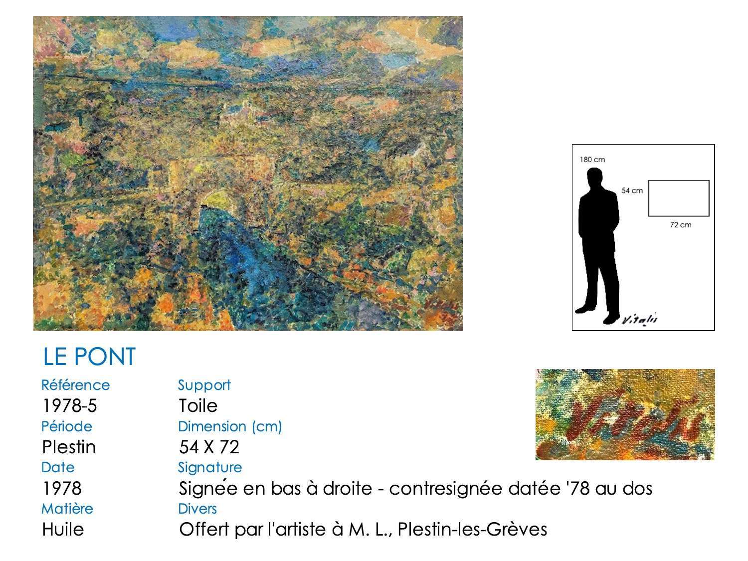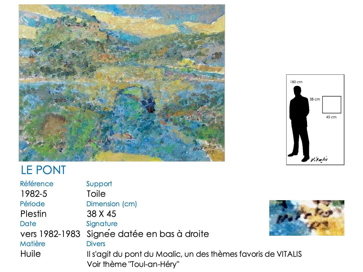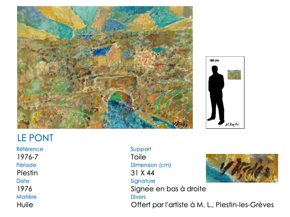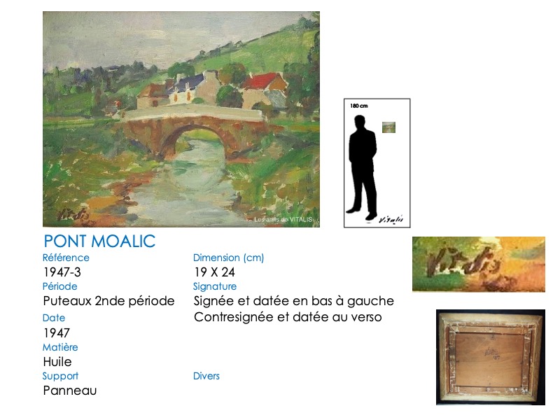 Le pont du Moalic a beaucoup inspiré VITALIS, et particulièrement son élégante arche ronde. Il l’a représenté dans sa vallée, avec les fermes et collines environnantes. Il a également repris la simple arche et son reflet, qui dessine un rond parfait. Aujourd’hui, l’arche en pierre a été remplacé par un tablier en béton, mais les méandres herbeux du Douron sont toujours là … Notez bien aussi la différence de représentation du tablier du pont, légèrement anguleux au début, plat par la suite. De même, un « village-château » s’insinue surplombant la vallée à partir de 1981 …